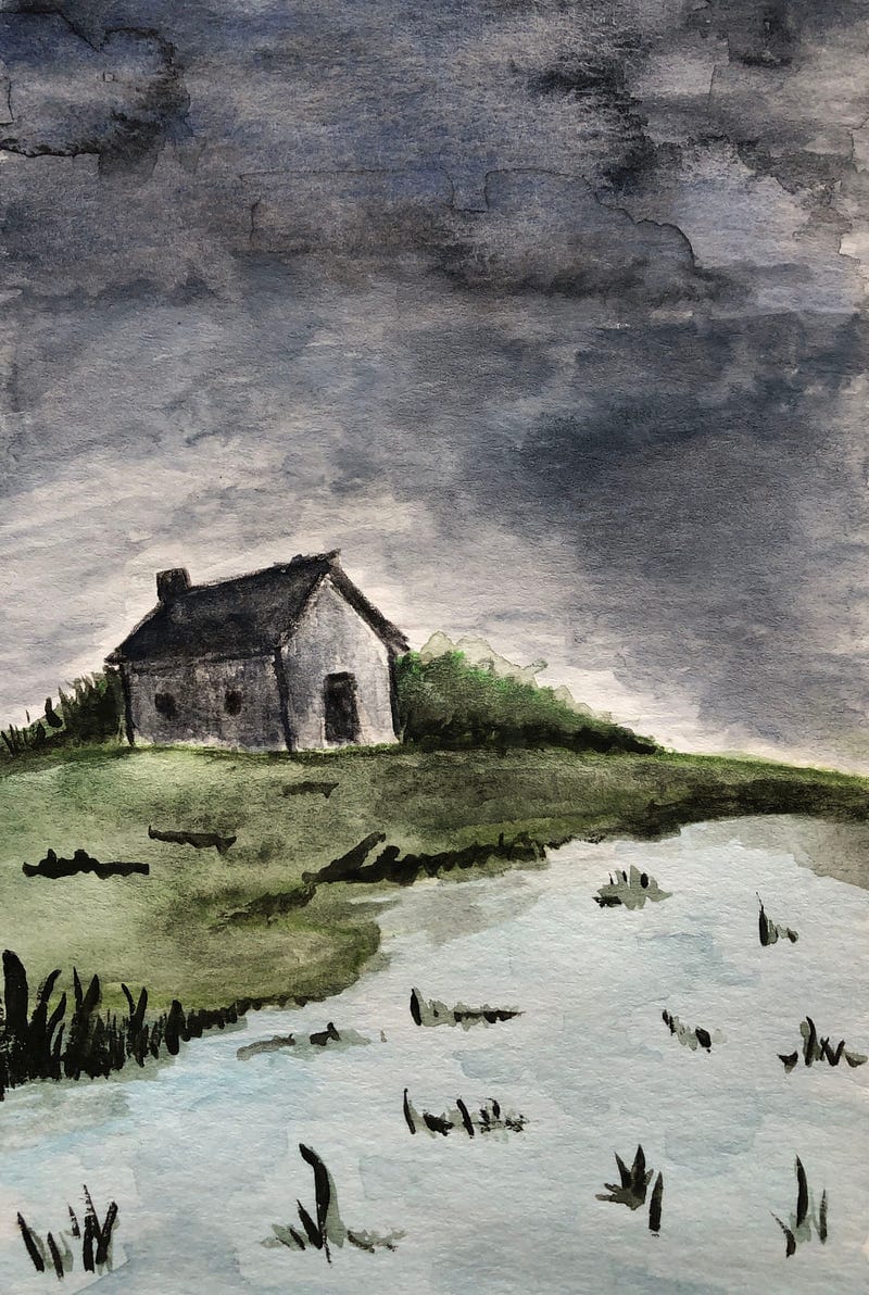 And so I sat. I wasn’t able to recapture everything I would have done on my Sunday morning, but finishing the painting at least gave me a little bit of peace. I only started working with watercolors about six weeks ago, and a lot of time is spent “waiting for things to dry” before I can decide if I want to do any additional work. I kept tweaking a little house and a pond in my painting before finally proclaiming it was “done.”
